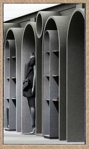 Дизайнеры для воплощения идеи выбрали серый фильц - получилось великолепно. Неоклассические арки над нишами и стеллажами создают на монохромном полотне материала интересные тени. Архитектурно причудливое пространство, выполненное из скромного материала, подчеркивающего лучшие стороны товара, отличается еще и отличным звукопоглощением.